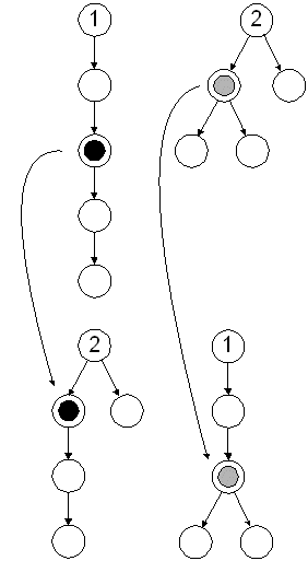 Crossover allows genetic material in two program trees to be combined with the intent to a program which combines the good traits of both original programs. The first step in the process is to duplicate both programs, so the original trees are preserved for later genetic operations. Next, a pivot point is randomly selected in each program, with the restriction that the operators must return the same data type. Finally, the sub-trees starting with the pivot nodes are exchanged. |